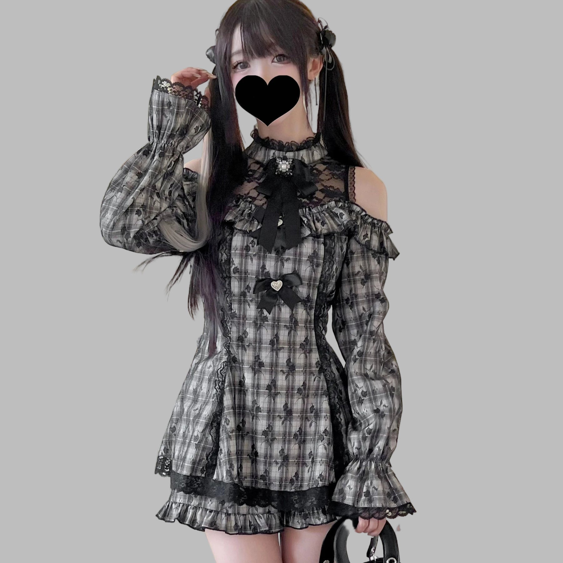 Abito a Quadri con Pizzo Grigio Jirai Kei con Spalle Scoperte