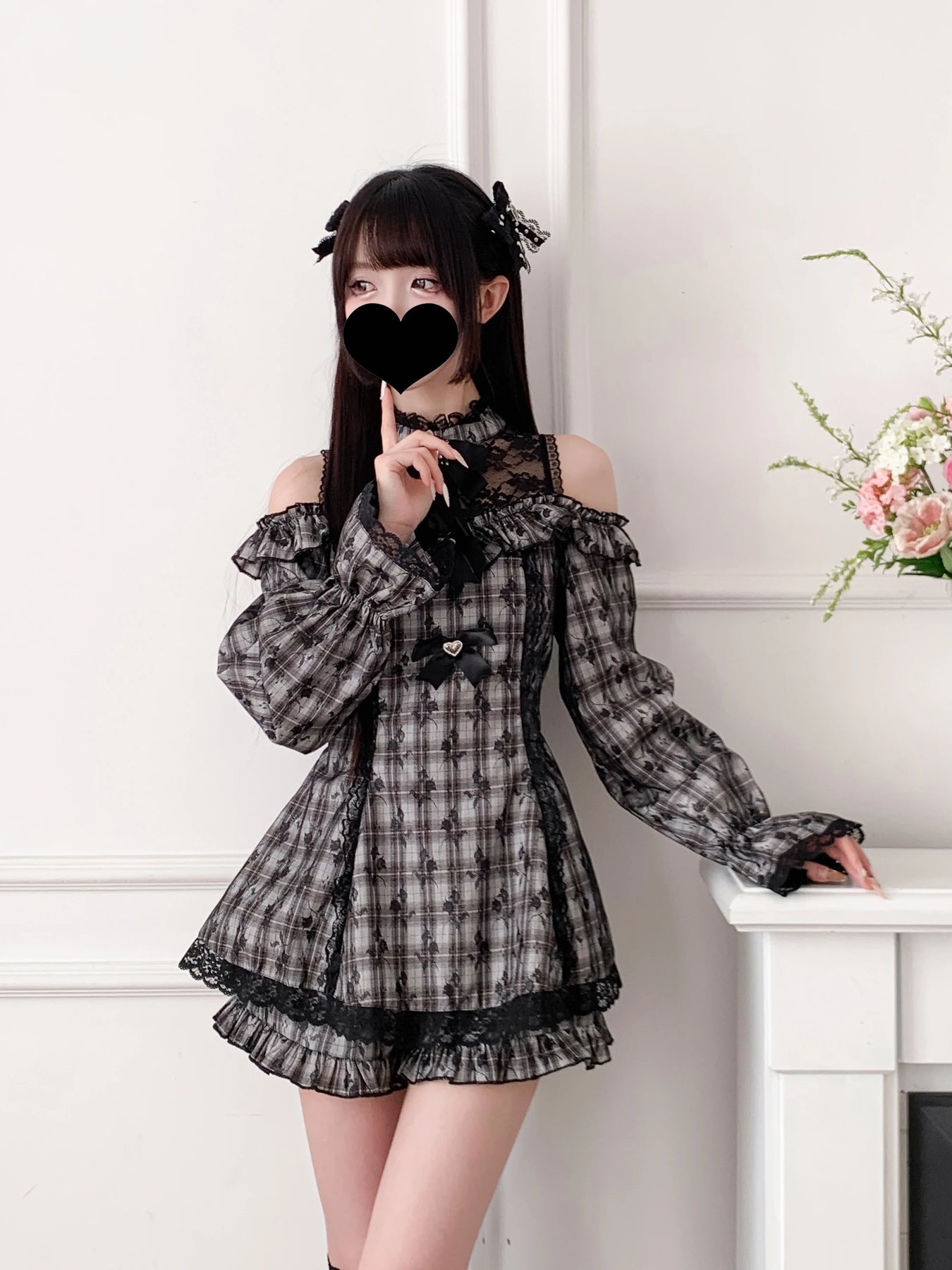 Vestito a Quadri con Pizzo Grigio Jirai Kei con Spalle Scoperte
