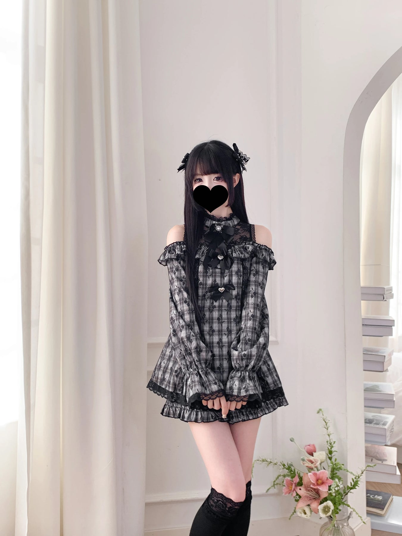 Abito a Quadri con Pizzo Grigio Jirai Kei con Spalle Scoperte Vedi opzioni