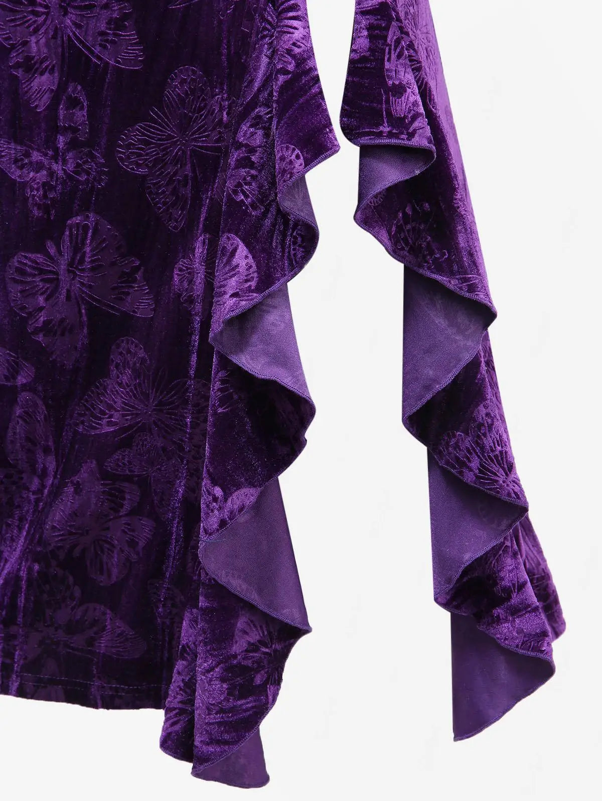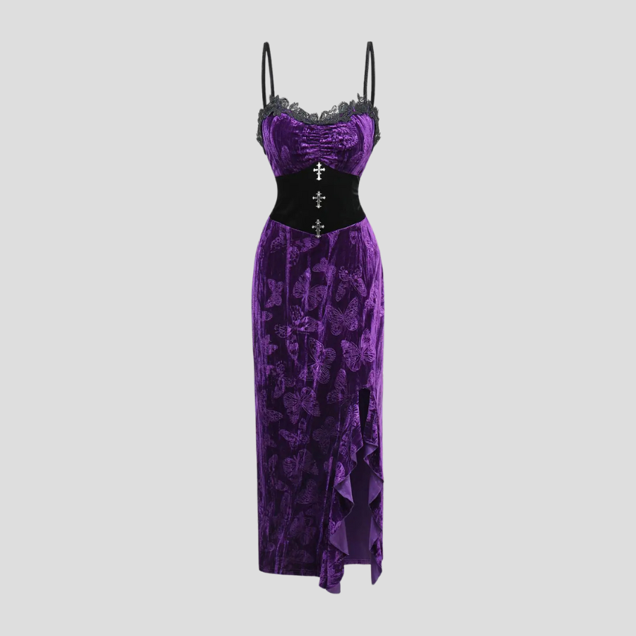Vestito gotico viola in velluto lungo con pizzo e croci