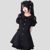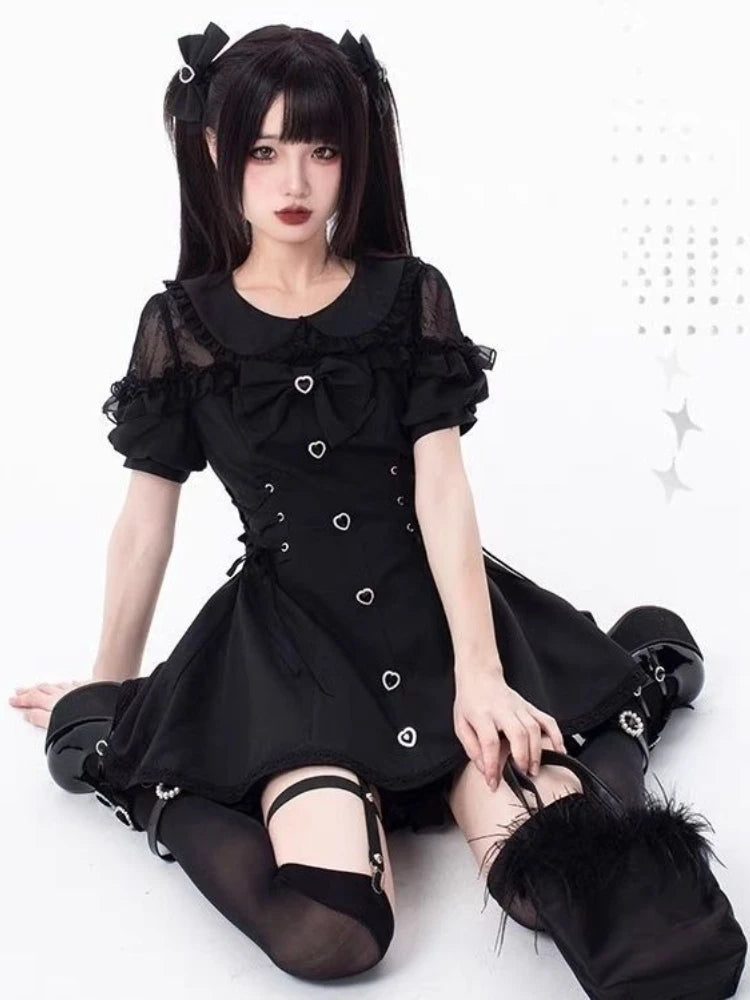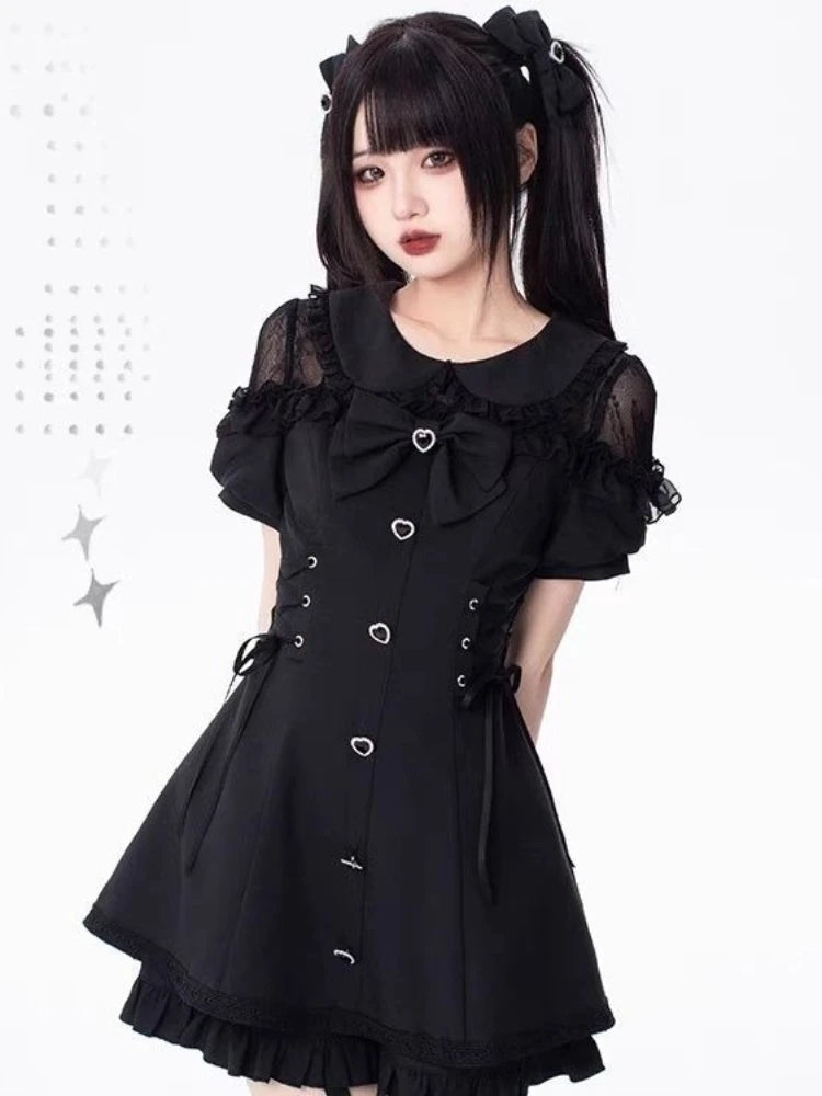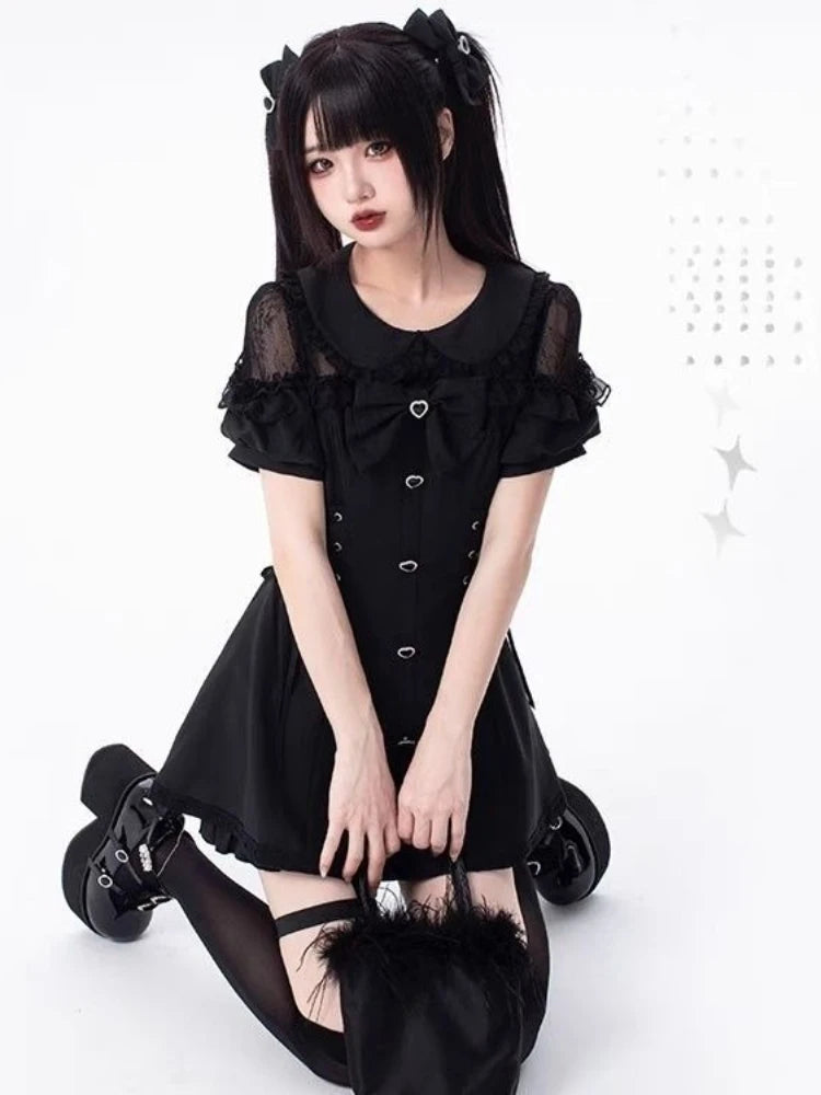 Abito Jirai Kei Nero con Bottoni a Cuore e Balze