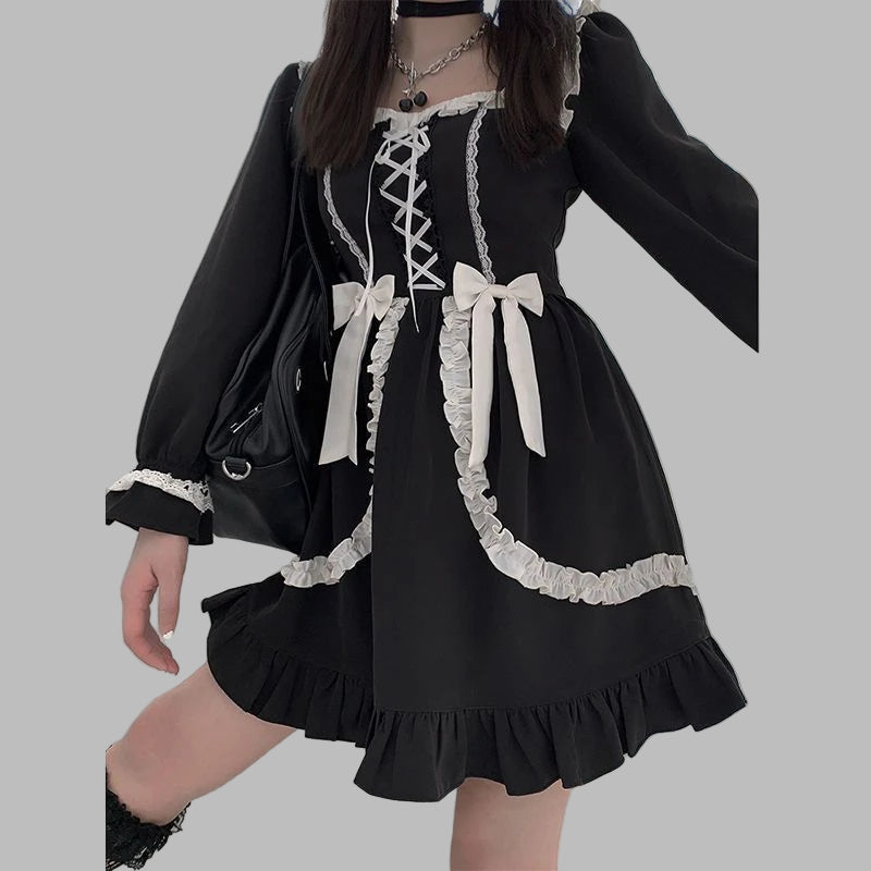 Abito Jirai Kei Nero con Fiocchi Bianchi e Lacci