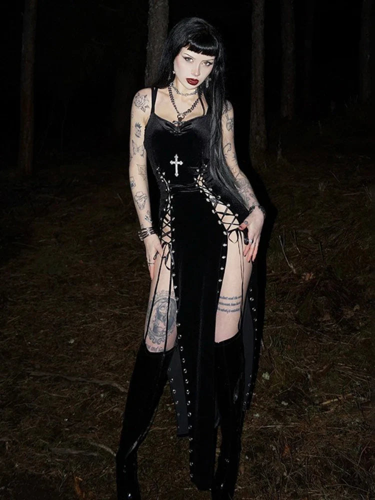 Abito nero con spacco stile grunge punk con croce e rete