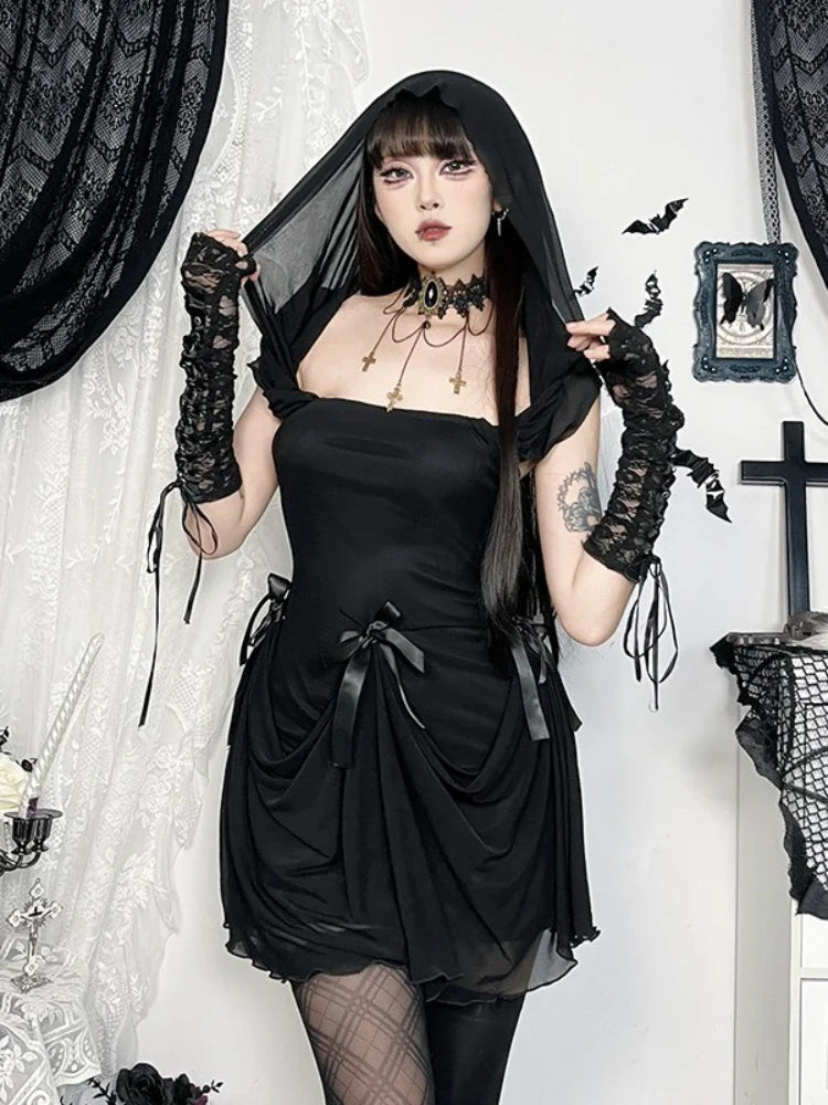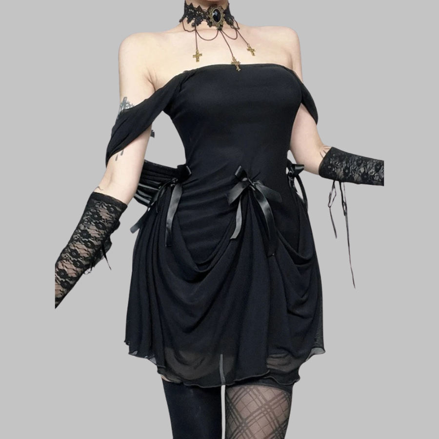 Abito nero grunge con maniche lunghe e gonna drappeggiata