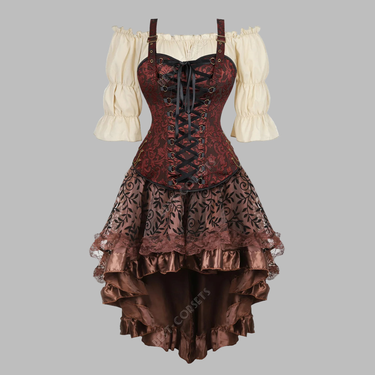 Abito Steampunk con Corsetto Allacciato Bordeaux e Pizzo