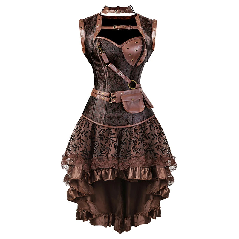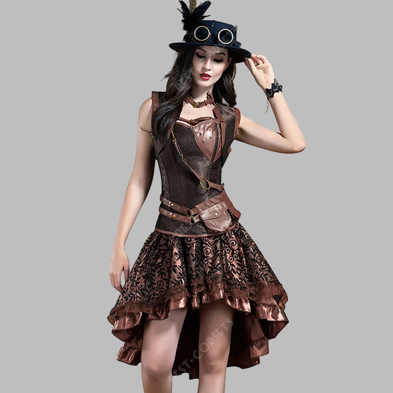 Abito Steampunk con Corsetto Marrone e Gonna Asimmetrica