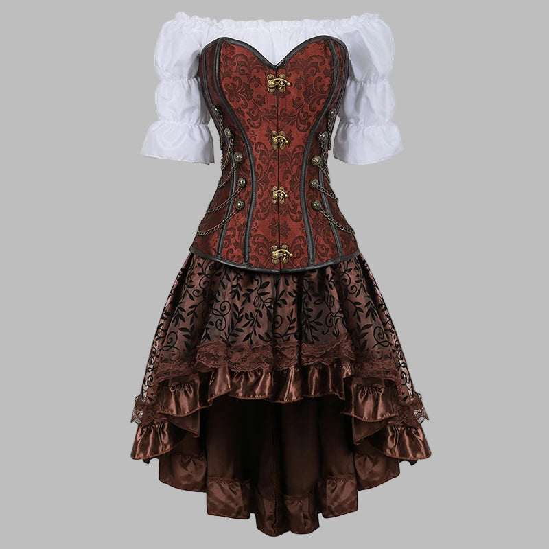 Abito Steampunk con Corsetto Rosso e Gonna a Balze