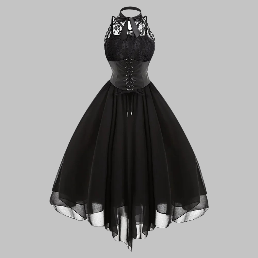Abito vittoriano nero senza maniche con pizzo e tulle