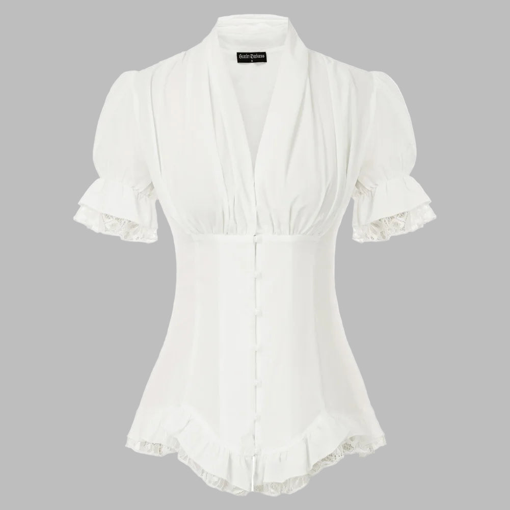 Blusa Bianca Steampunk con Pizzo e Maniche Corte