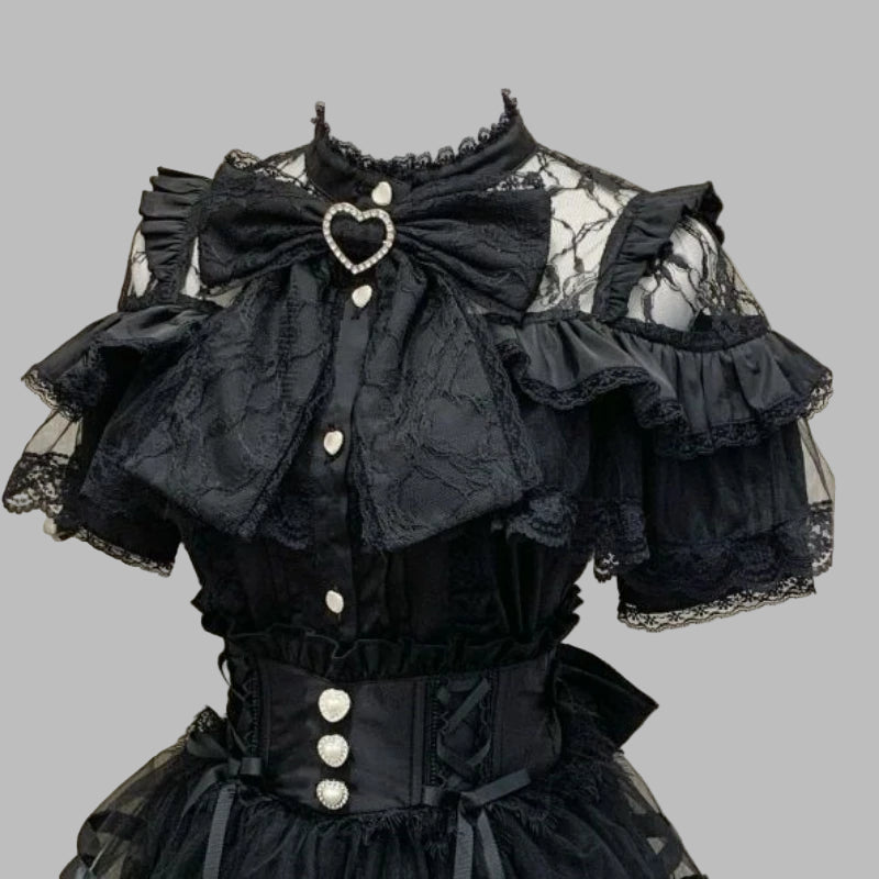 Blusa Gotica Nera in Pizzo con Fiocco e Cintura a Corsetto