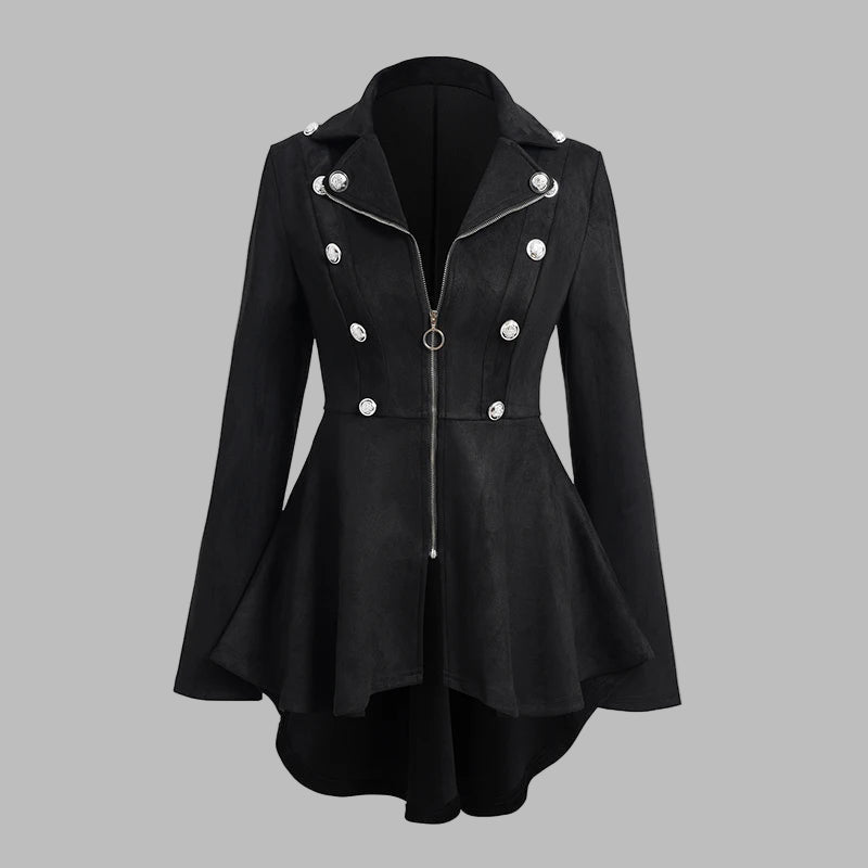 Cappotto gotico nero da donna svasato con bottoni e cerniera