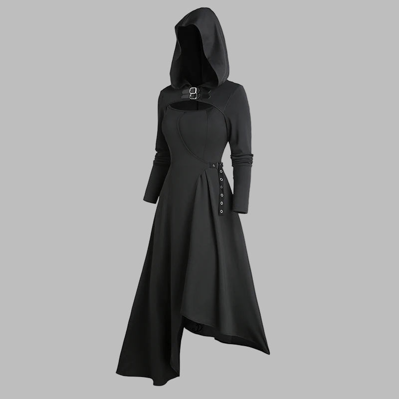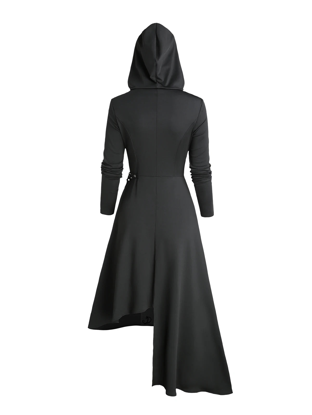 Cappotto lungo nero asimmetrico con cappuccio e cintura