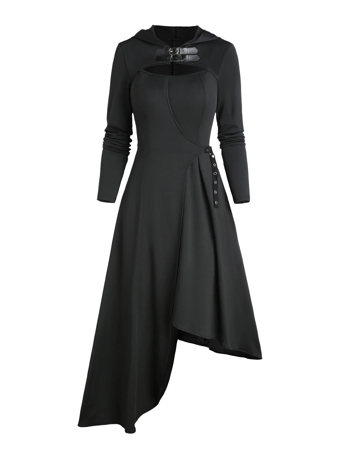 Cappotto lungo nero con cappuccio e cintura asimmetrico Vedi opzioni