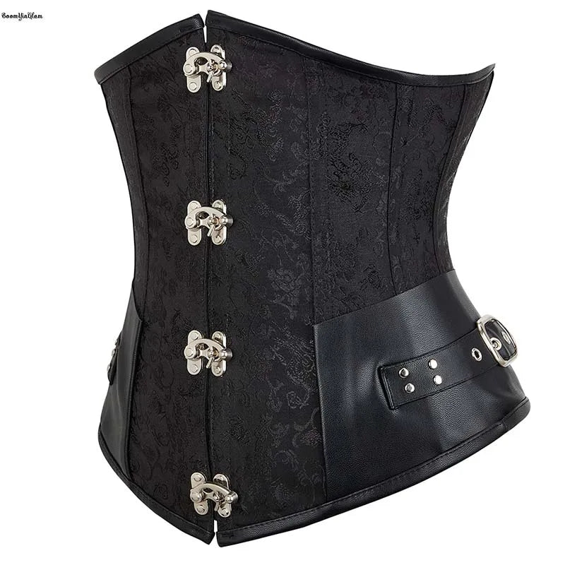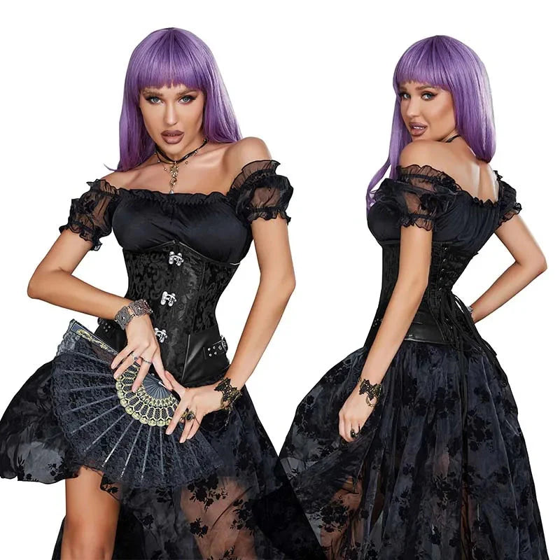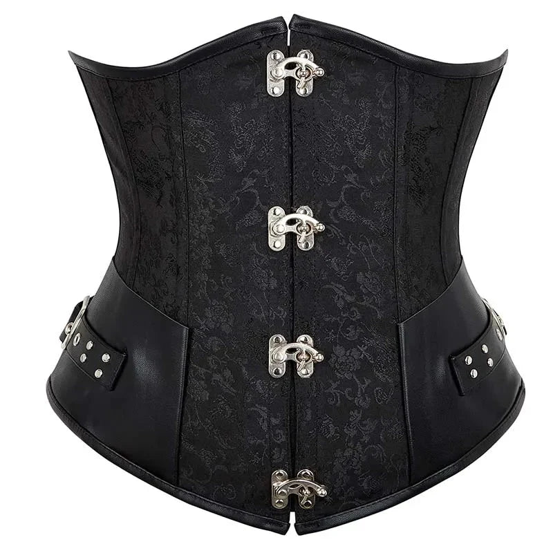 Questo corsetto steampunk sotto il seno dal design audace modella perfettamente la silhouette con carattere. Dotato di 12 stecche in acciaio, offre un forte supporto e un effetto snellente per la vita. Ideale per eventi, uscite serali, cosplay o come accento deciso per lo stile quotidiano. Include perizoma in colore coordinato.