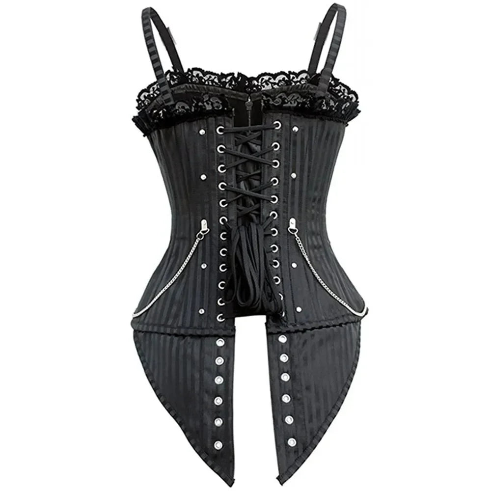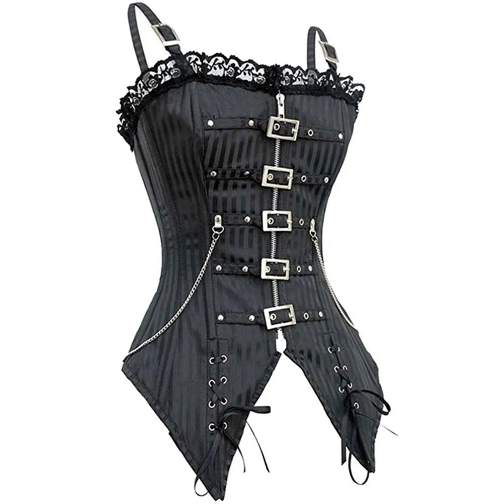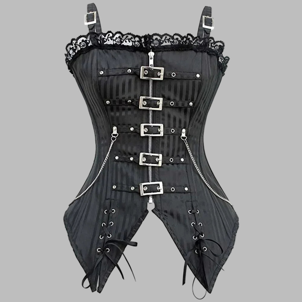 Corsetto gotico punk nero a righe con fibbie, borchie e catene
