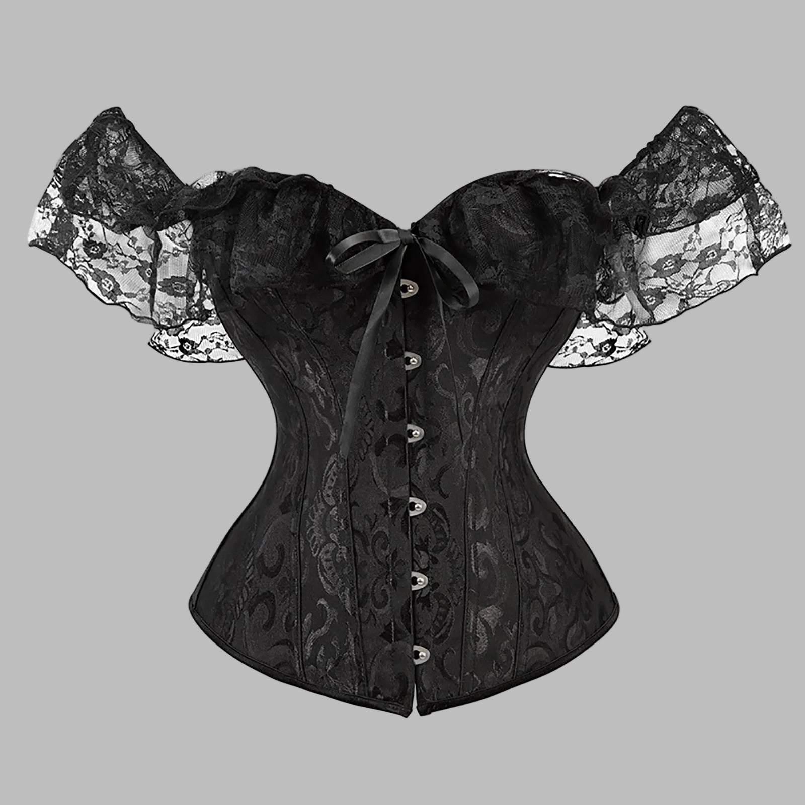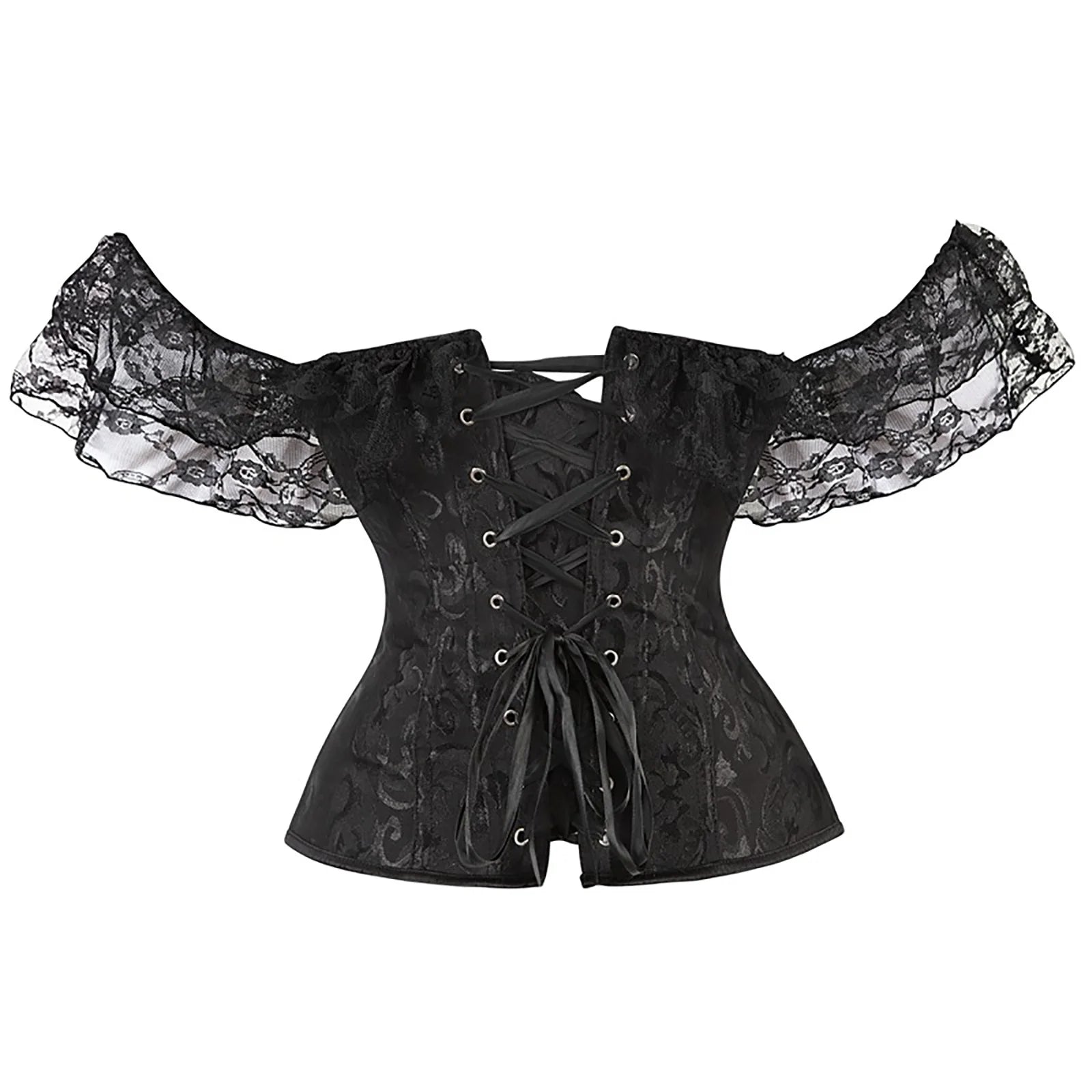 Corsetto Gotico Punk Rock Nero in Broccato con Maniche in Pizzo e Allacciatura