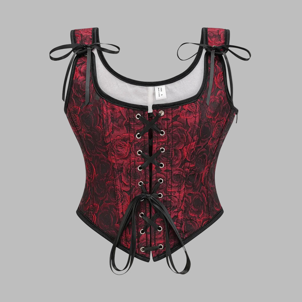 Corsetto gotico rosso e nero con lacci e rose con spalline