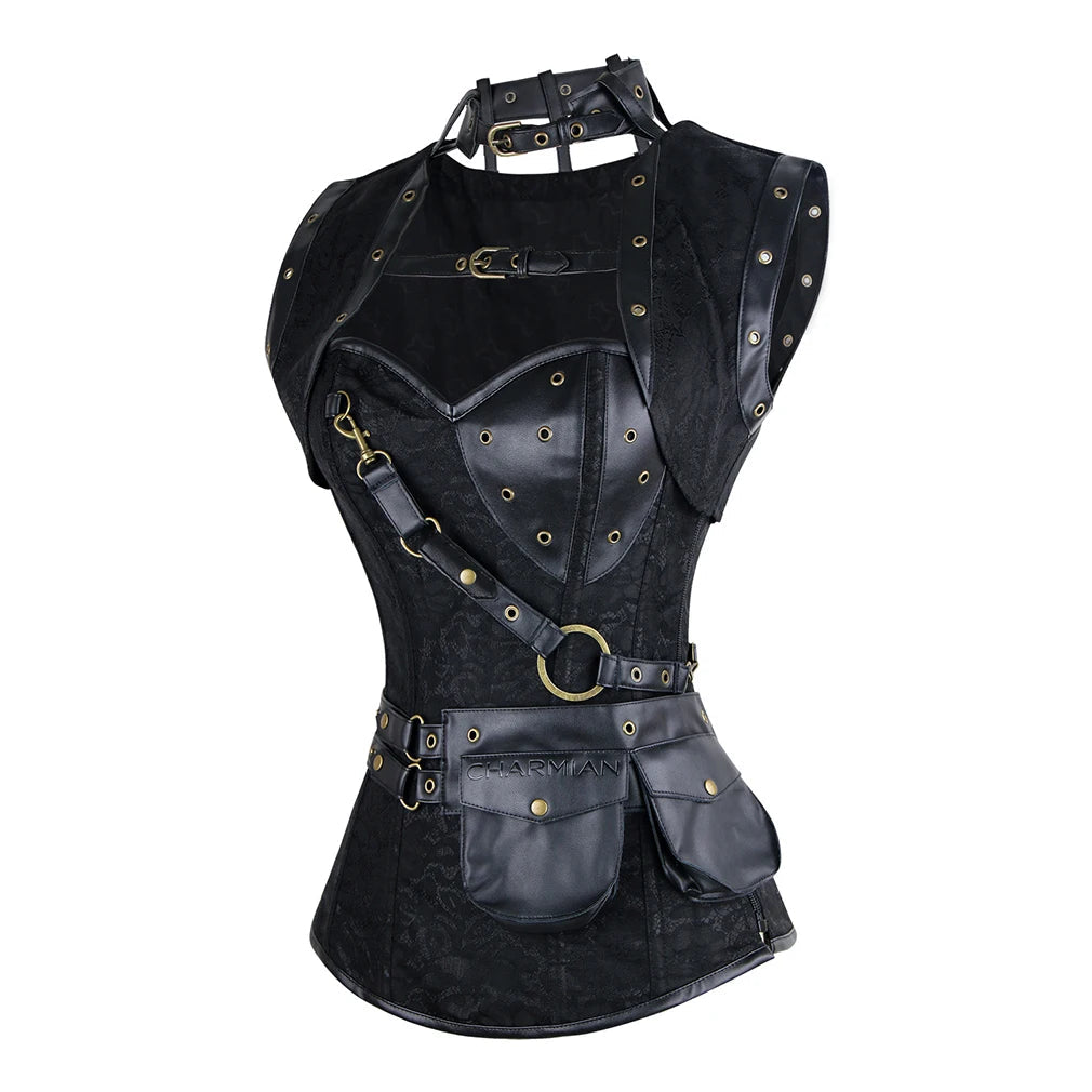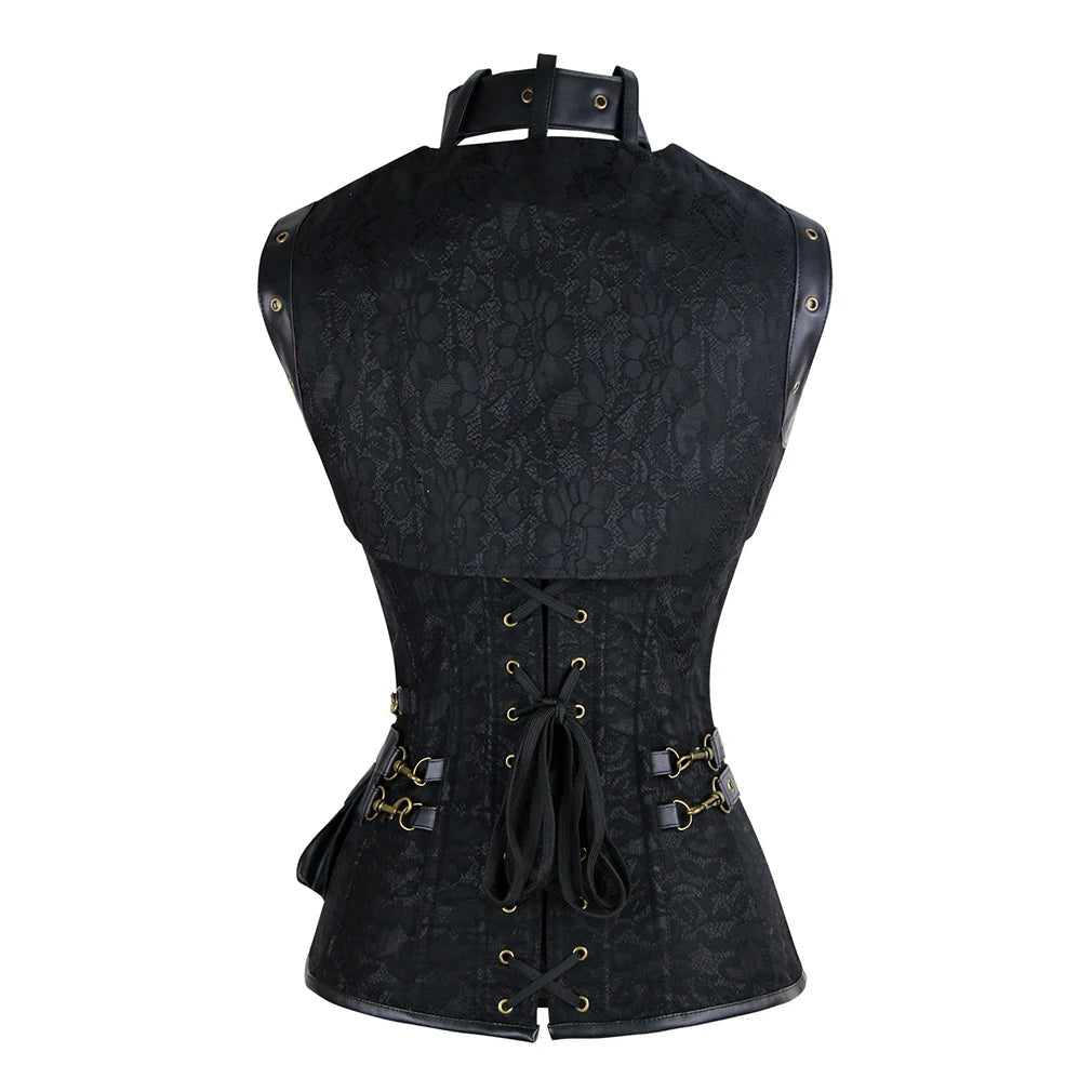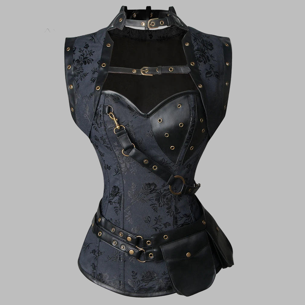Corsetto Gotico Steampunk con Motivo Floreale e Cinghie in Pelle
