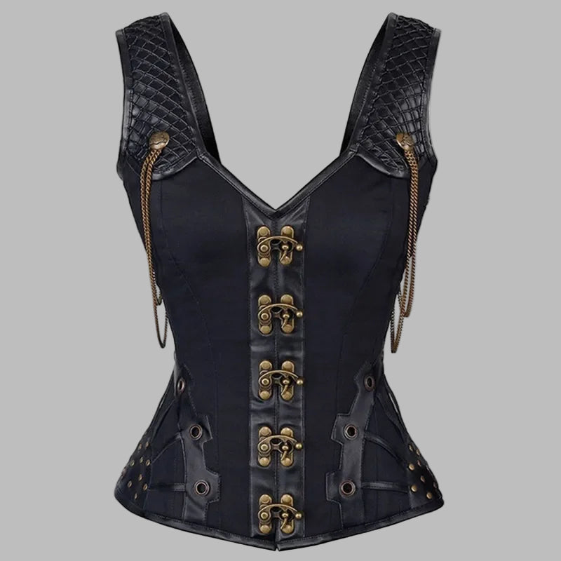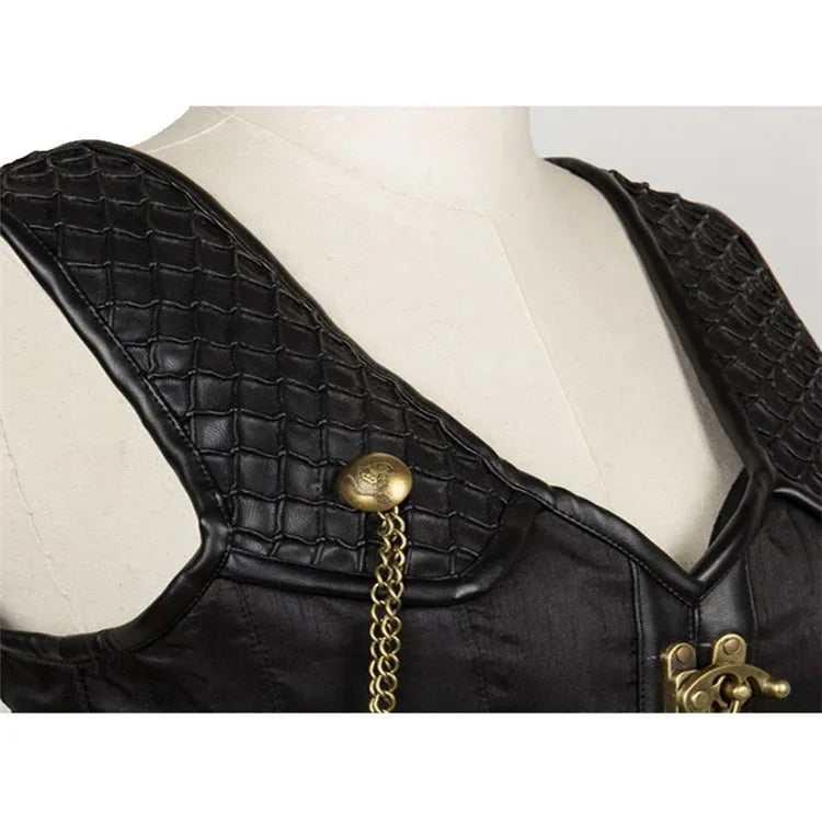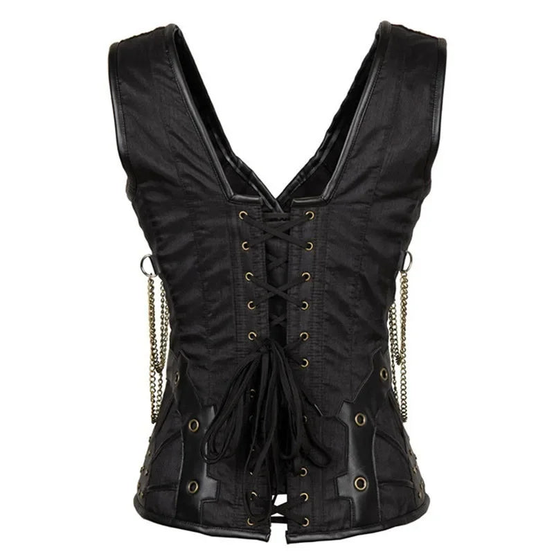 Corsetto Gotico Steampunk in Pelle con Catene e Chiusure Metalliche Nero