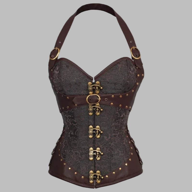 Corsetto Steampunk Marrone con Motivo Glitterato e Fibbie in Metallo da Donna