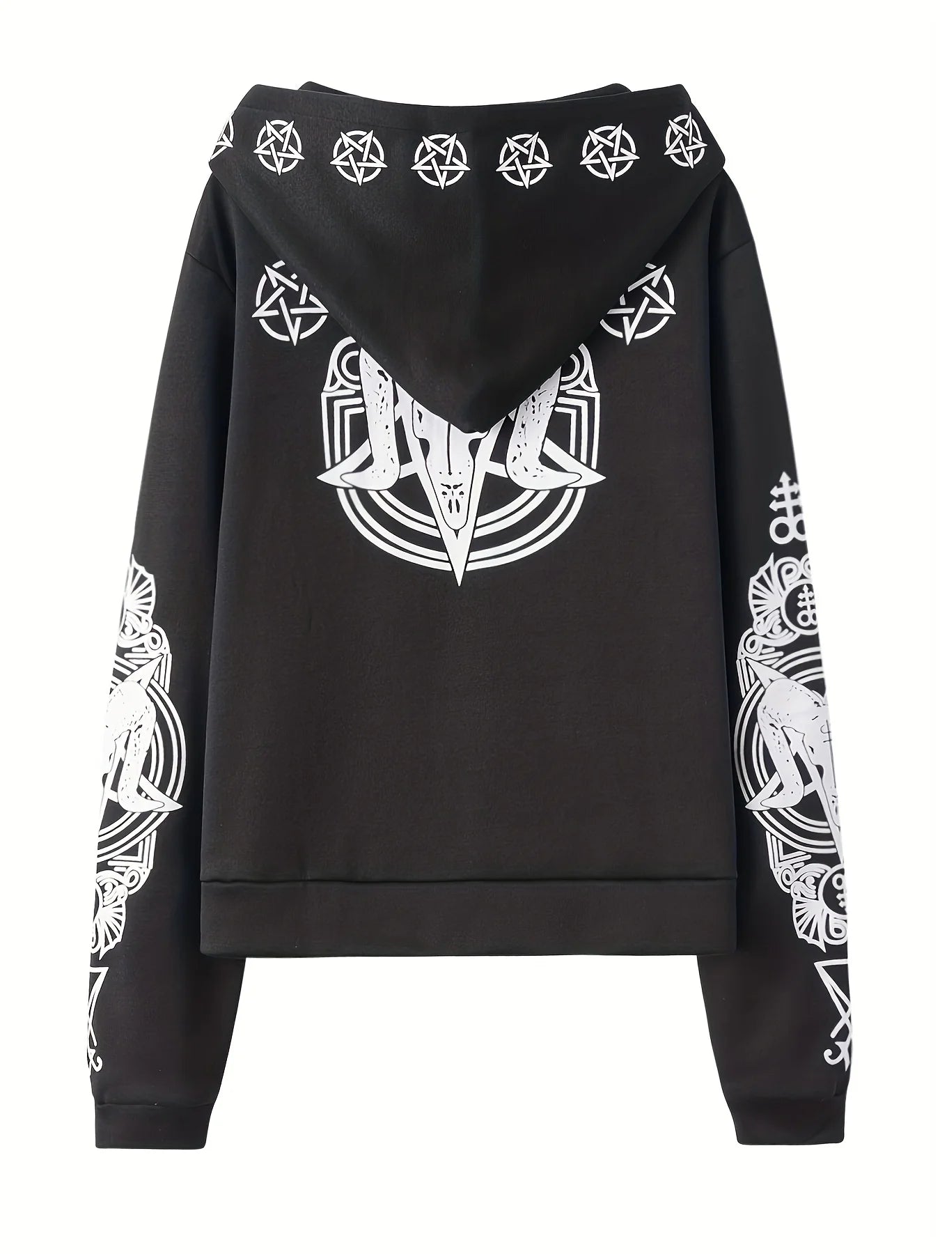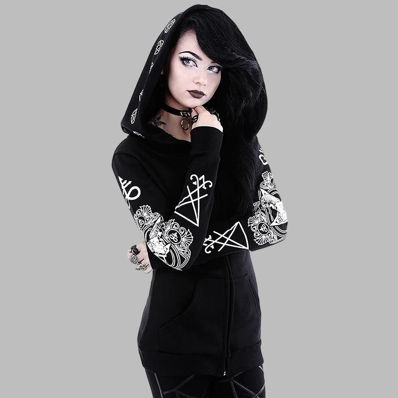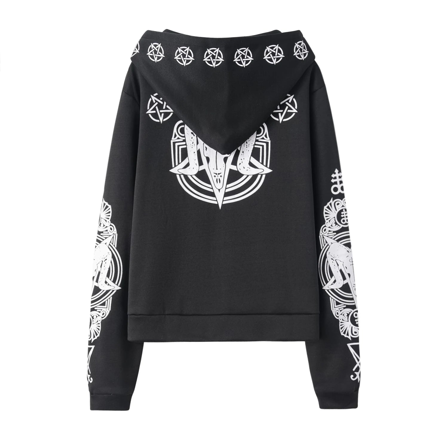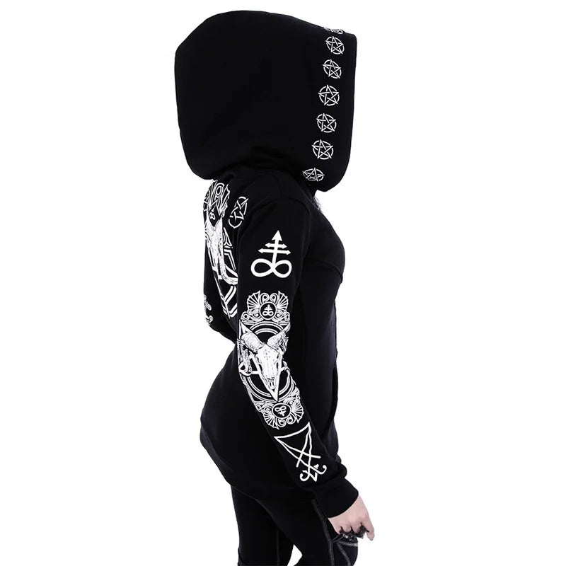 Felpa Gotica Nera con Teschio e Pentagramma con Cappuccio Darkwear Donna