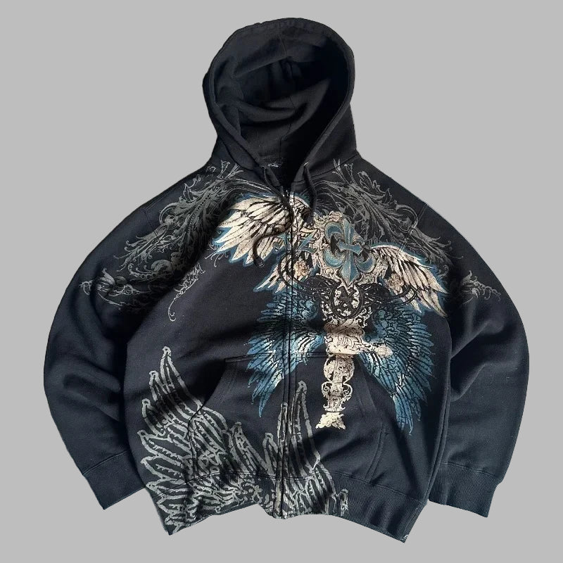 Felpa Nera Metal con Stampa di Ali e Teschi Vedi opzioni