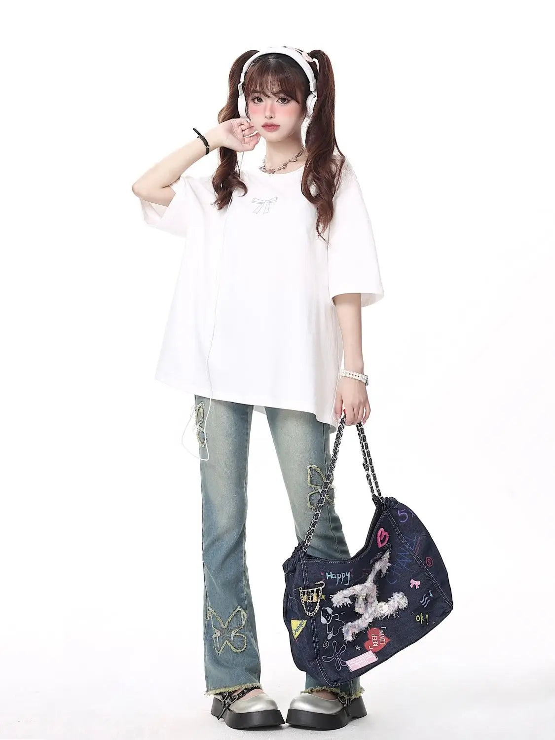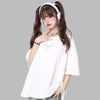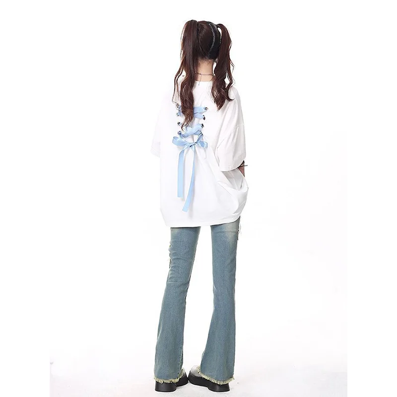 Felpa Rock Bianca con Lacci sulla Schiena e Fiocco Blu