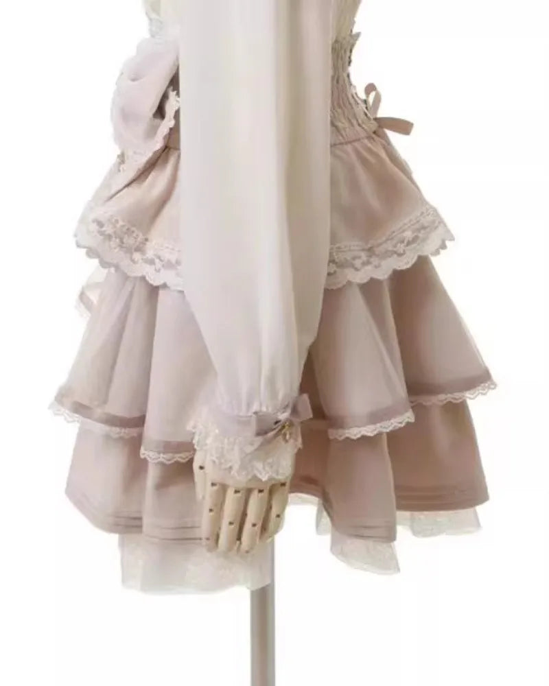 Gonna Beige Jirai Kei con Fiocco e Rifiniture in Pizzo