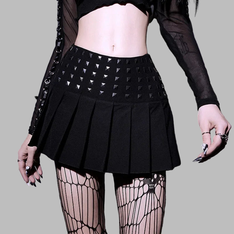 Gonna Mini Nera a Pieghe con Borchie Stile Grunge Donna