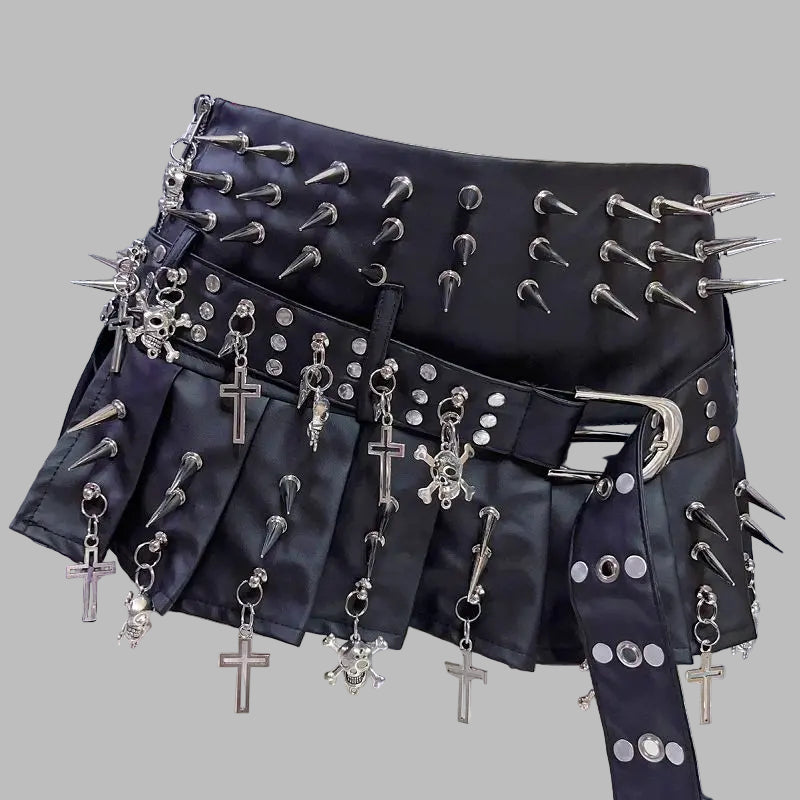 Gonna Plissettata Nera con Borchie e Catene Stile Metal