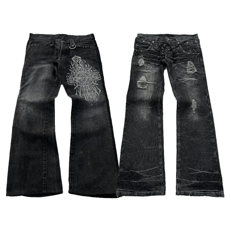 Jeans Grunge a Zampa con Strappi e Ricami Gotici 1