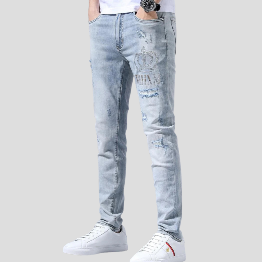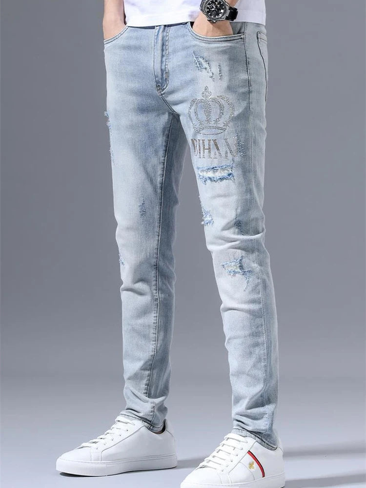Rock Jeansy z Przetarciami i Koroną Jasne Niebieskie