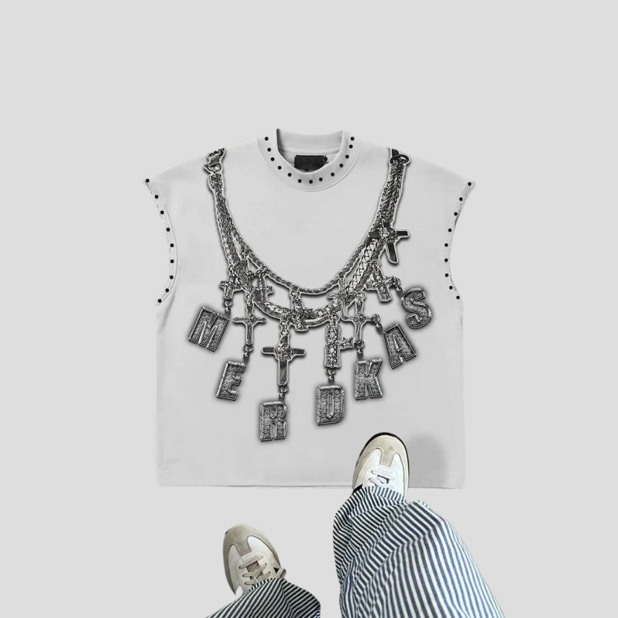 Maglietta Bianca Punk con Grafica a Catene Metallica