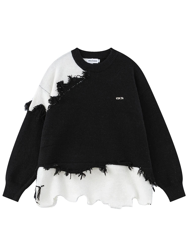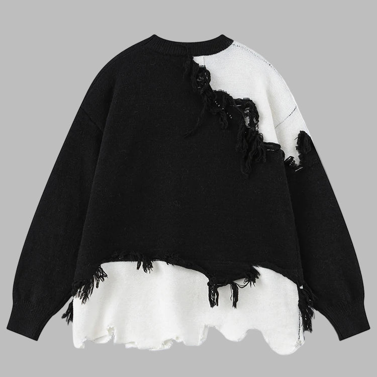Maglione Punk Nero e Bianco con Strappi e Frange