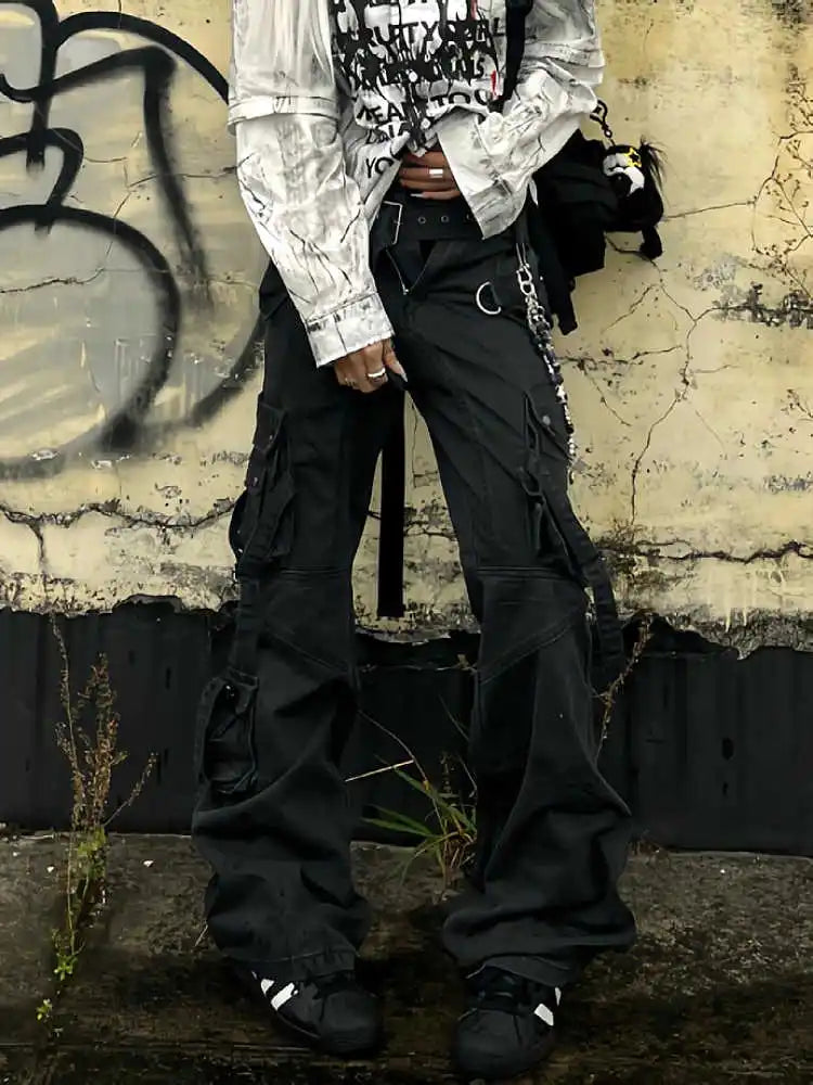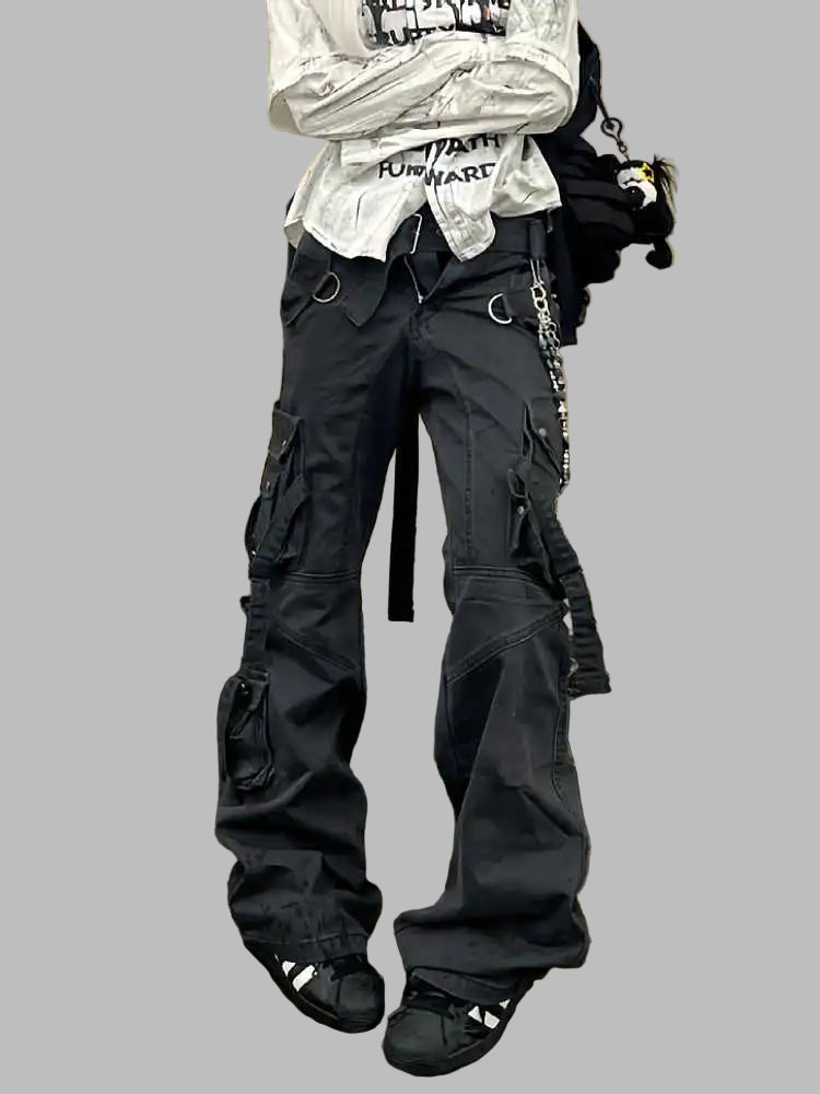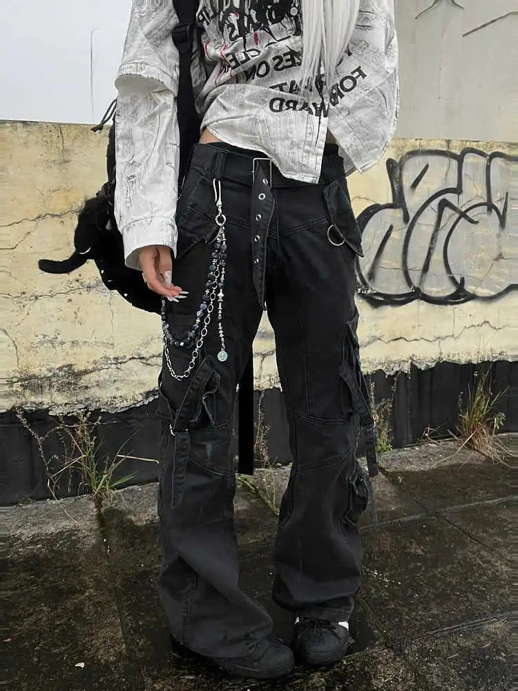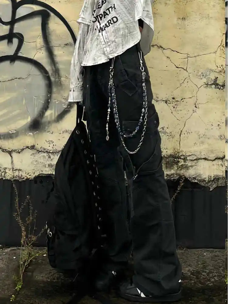 Pantaloni Cargo Gotici Punk Neri Larghi con Tasche e Catene Unisex