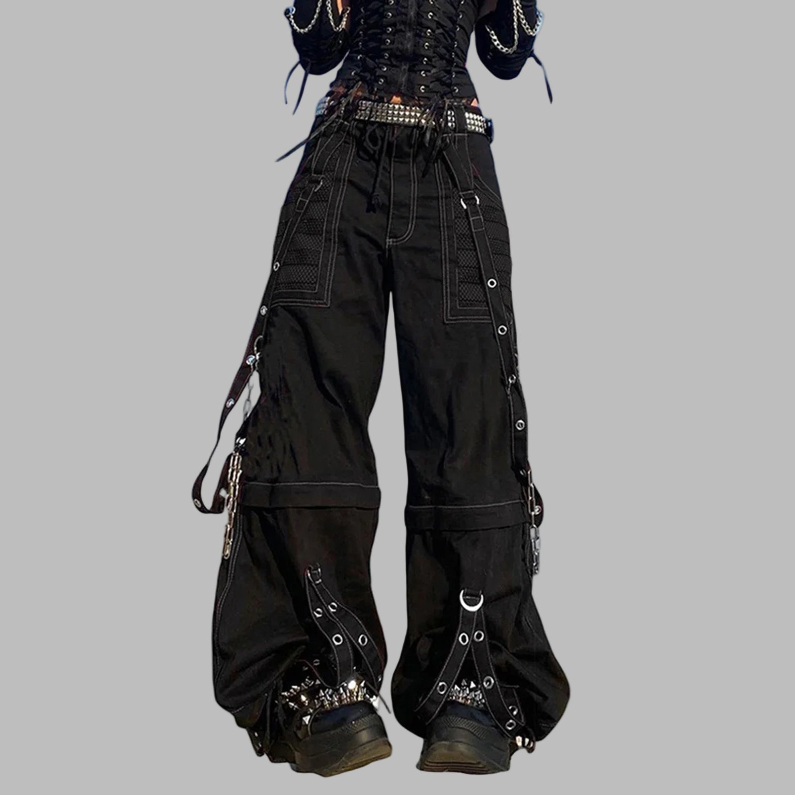Pantaloni Cargo Punk in Metallo con Catene e Borchie Neri