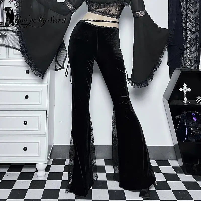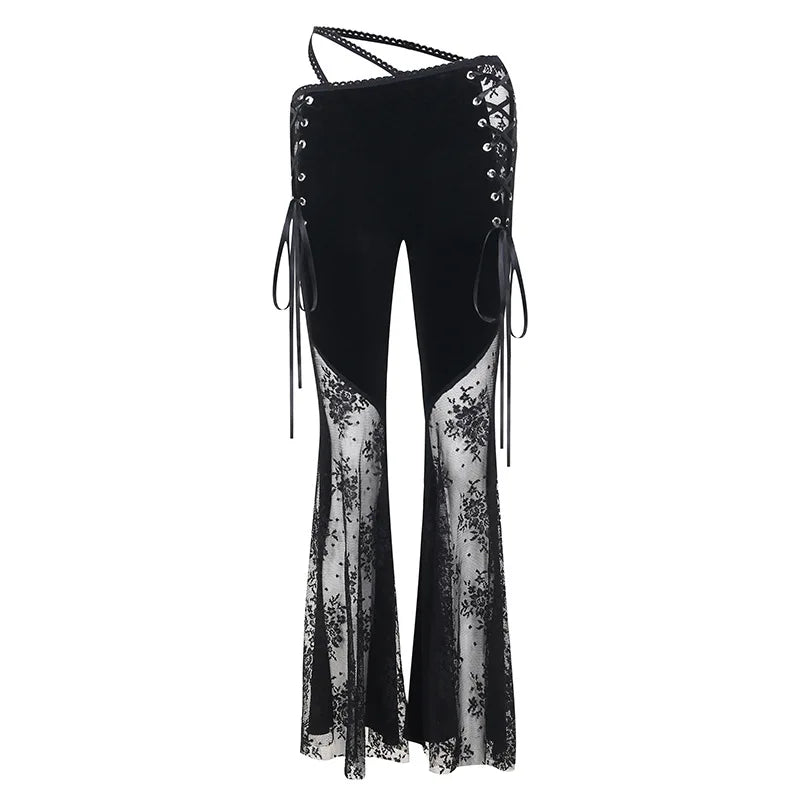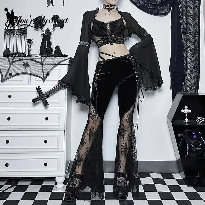 Pantaloni Gotici Neri con Spacchi e Dettagli in Pizzo