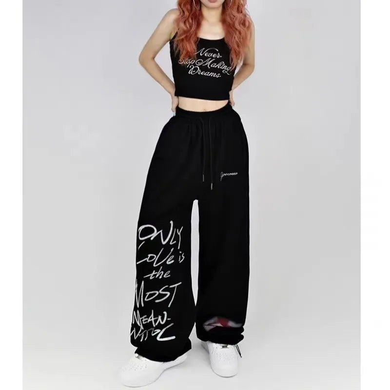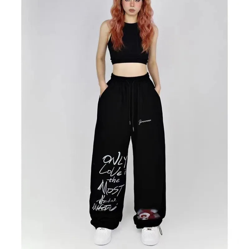 Pantaloni Neri Gotici Rock con Scritte Oversize in Stile Grunge
