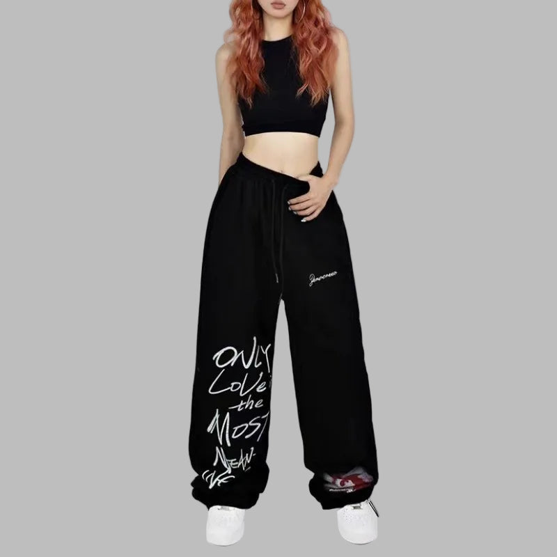 Pantaloni Gotici Neri Oversize con Scritte in Stile Grunge