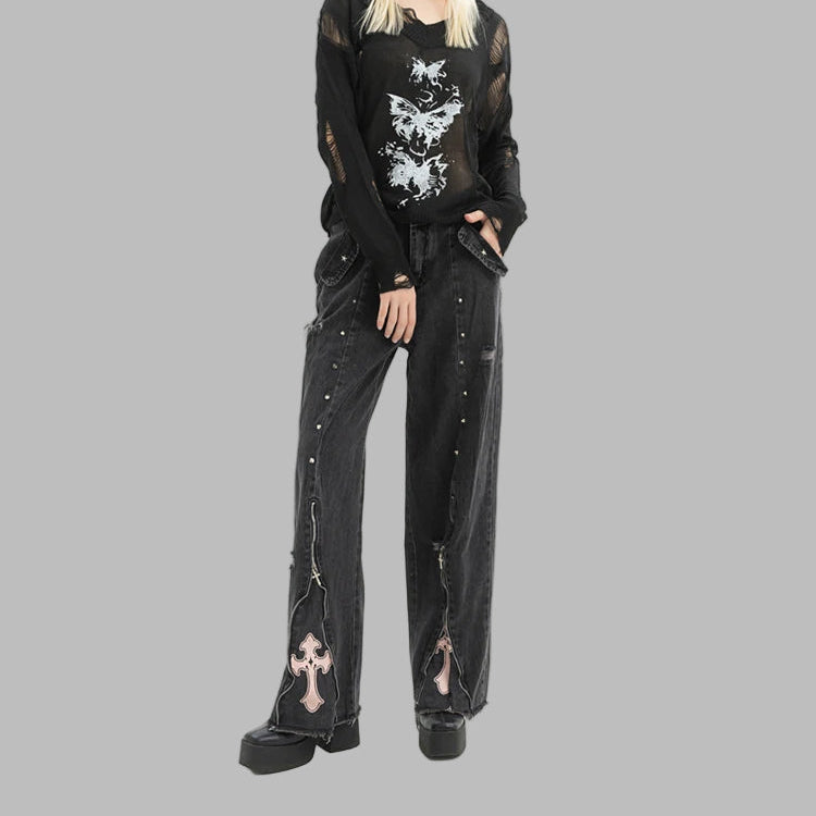 Pantaloni larghi gotici punk in denim con croci e borchie