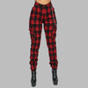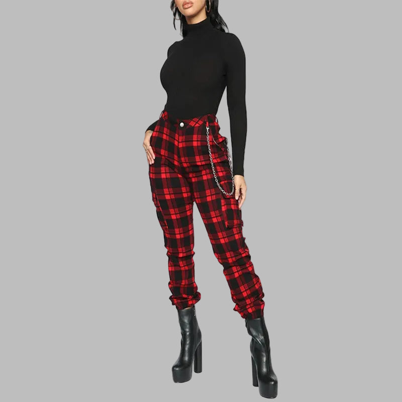 Pantaloni Punk Aderenti a Quadri Rosso Nero con Catena