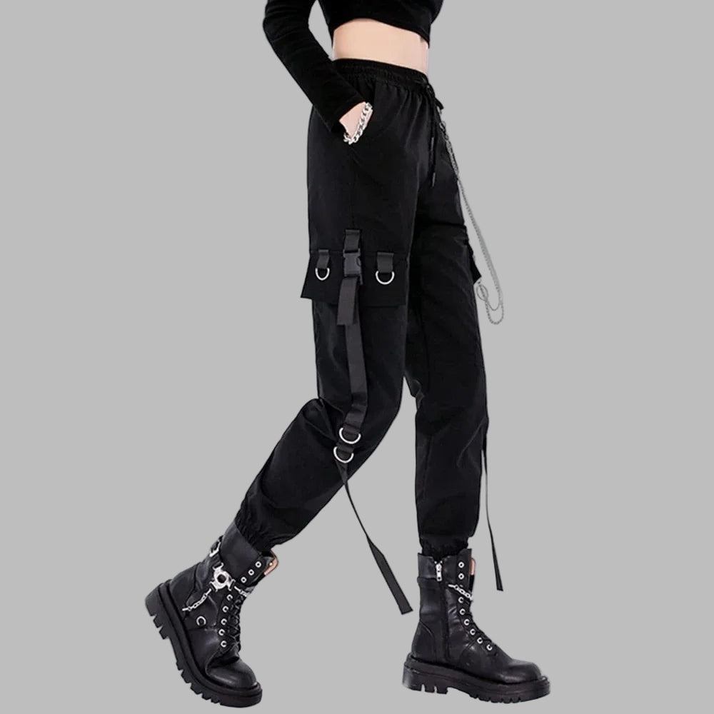 Pantaloni Punk Neri con Anelli Metallici e Cinghie Tattiche