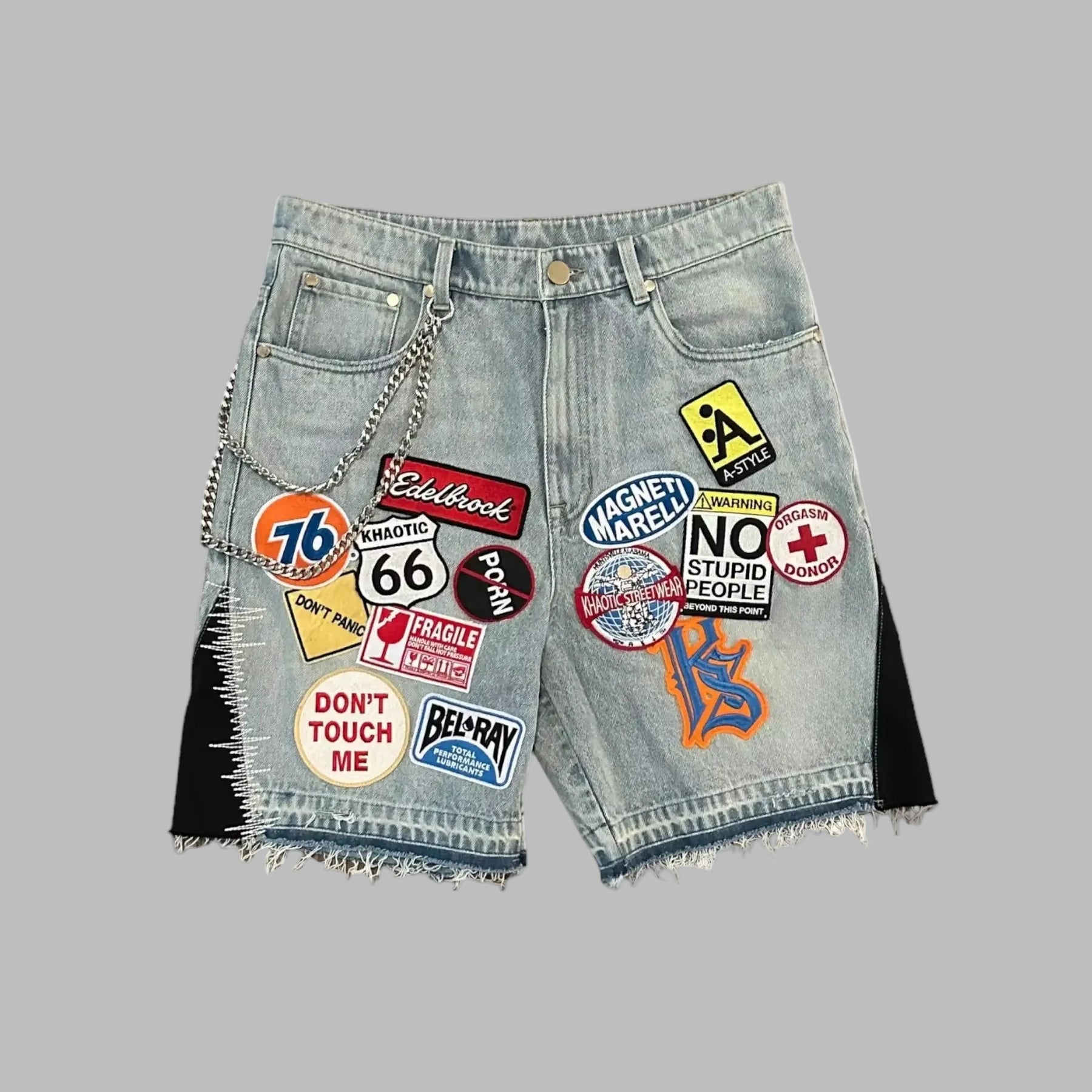 Shorts di Jeans Grigi Rock con Toppe Colorate e Catena XXL