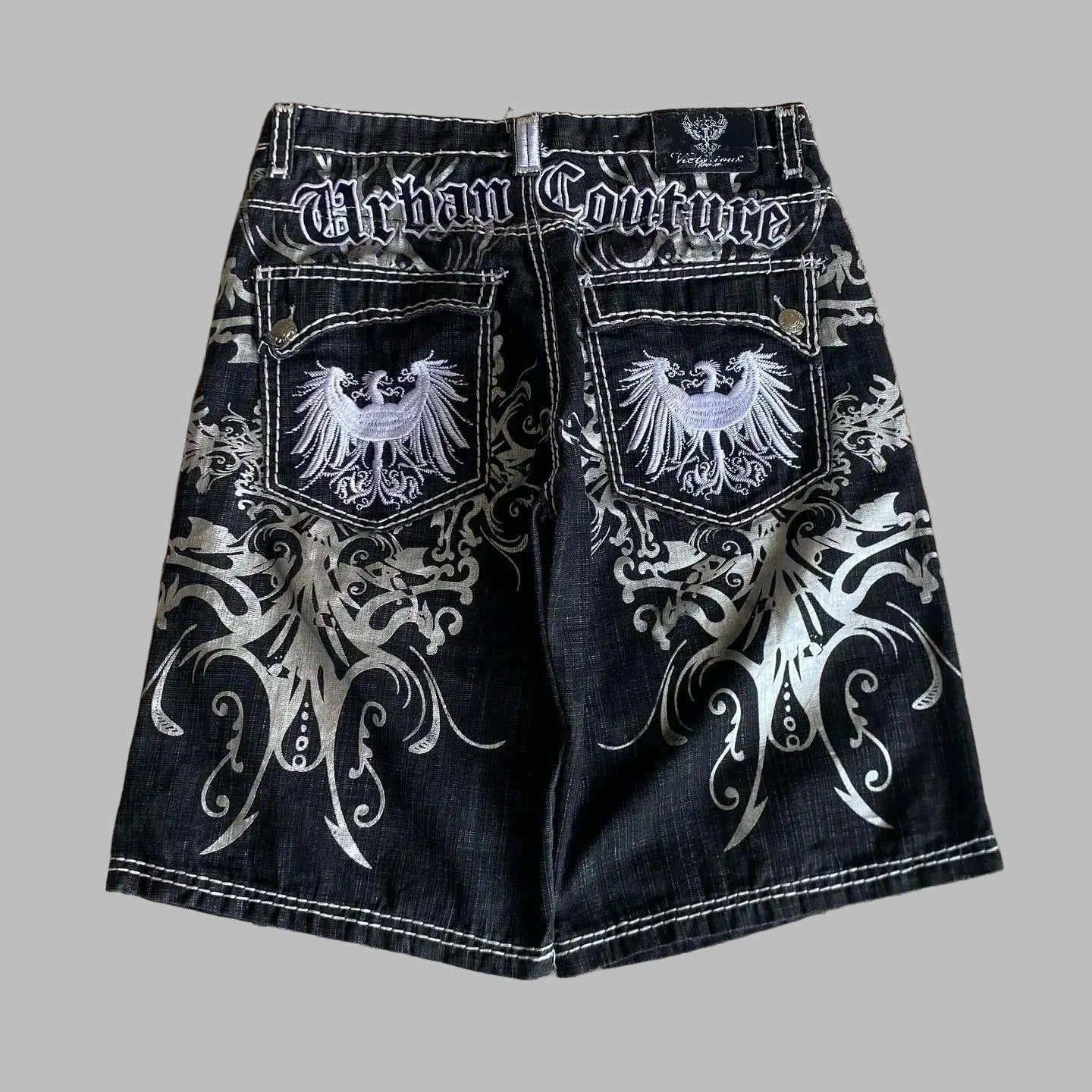 Shorts di Jeans Grunge Metal con Aquile e Motivi Tribali
