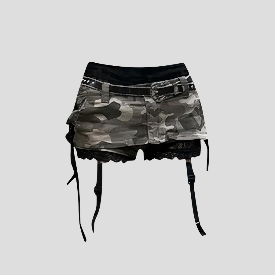 Shorts punk mimetici corti con pizzo e cintura da donna