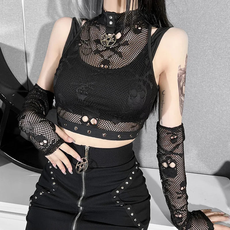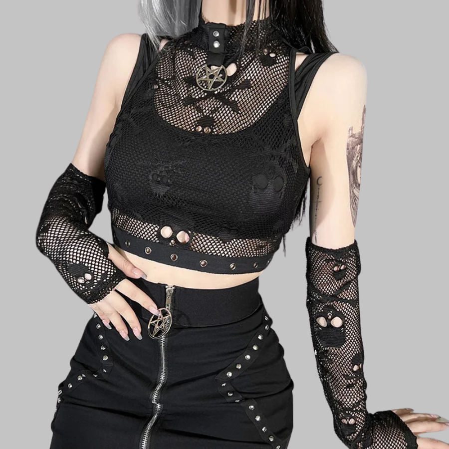 Top Gotico Nero in Rete con Stampa di Teschio e Maniche in Tulle