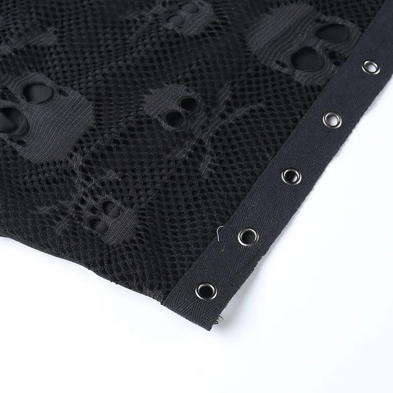 Top Gotico Nero in Rete con Stampa di Teschi e Maniche in Tulle