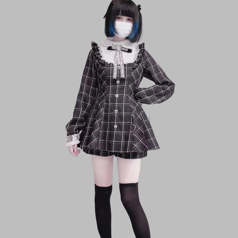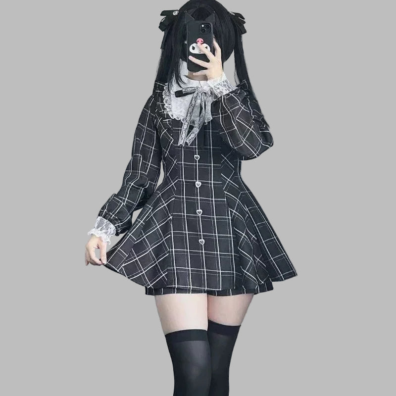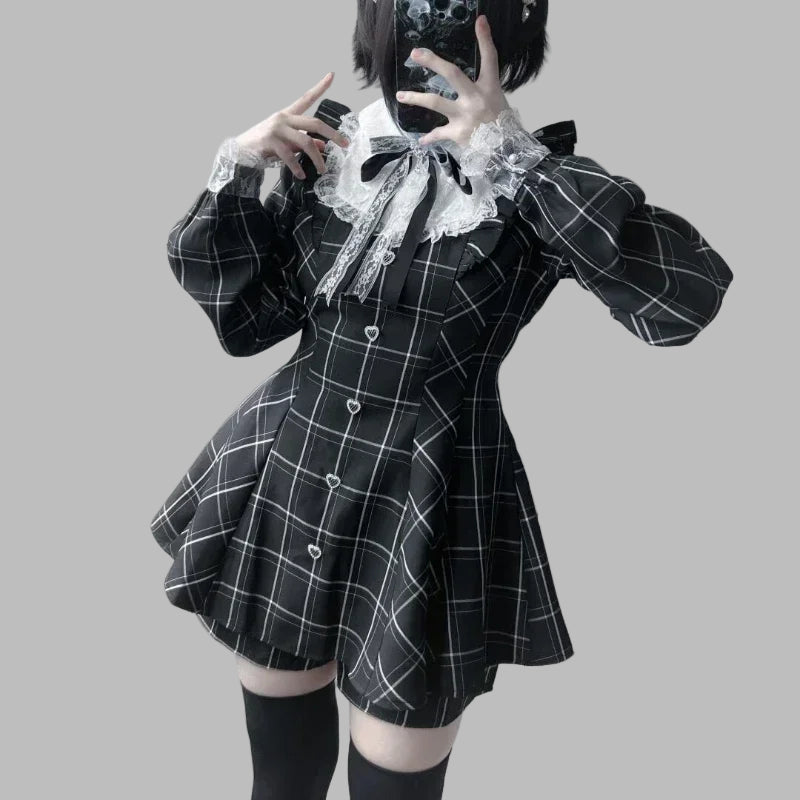 Vestito Gothic Lolita Nero a Quadri con Pizzo