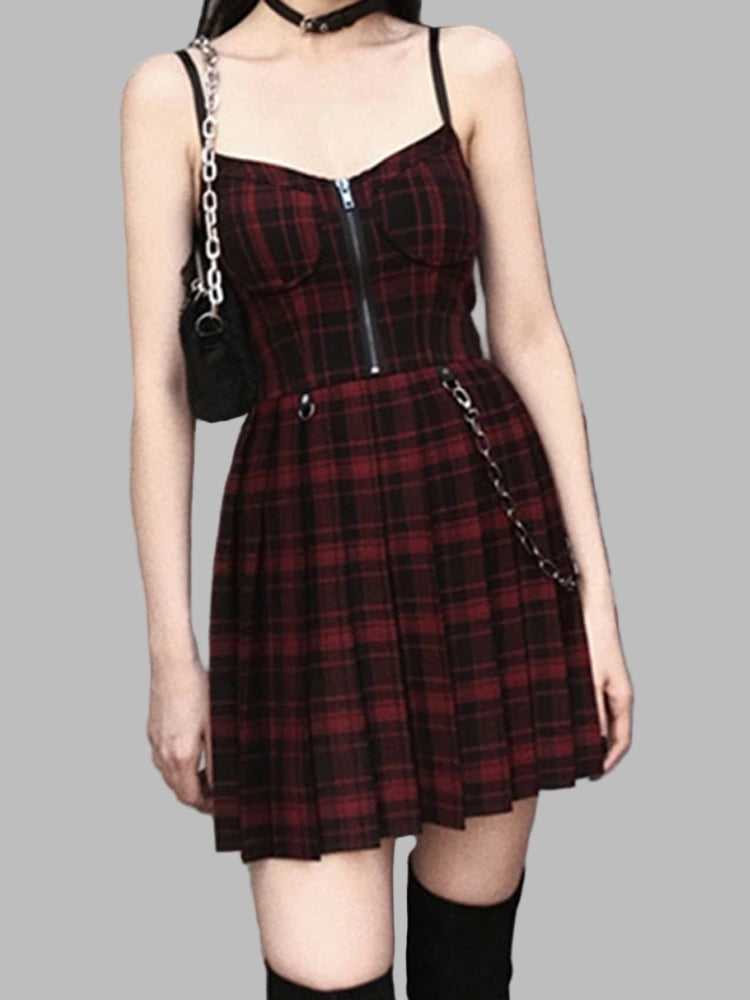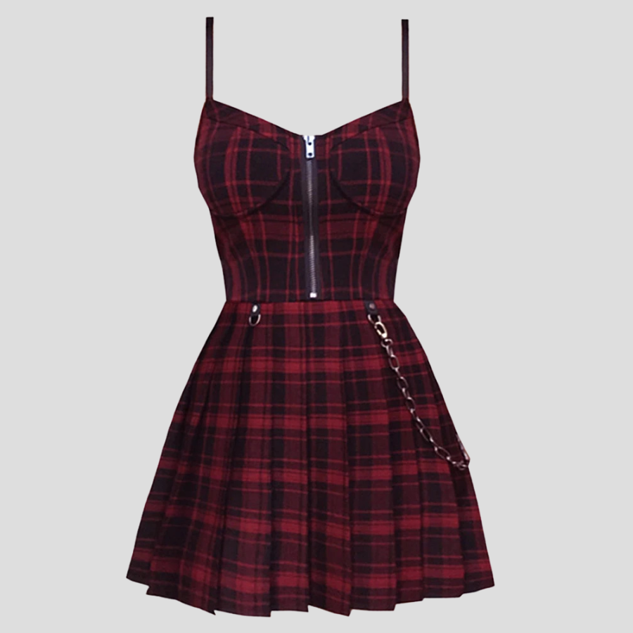 Vestito Grunge Punk a Quadri Bordeaux con Catena