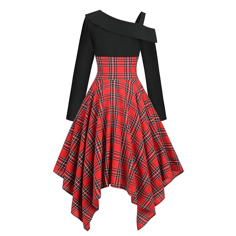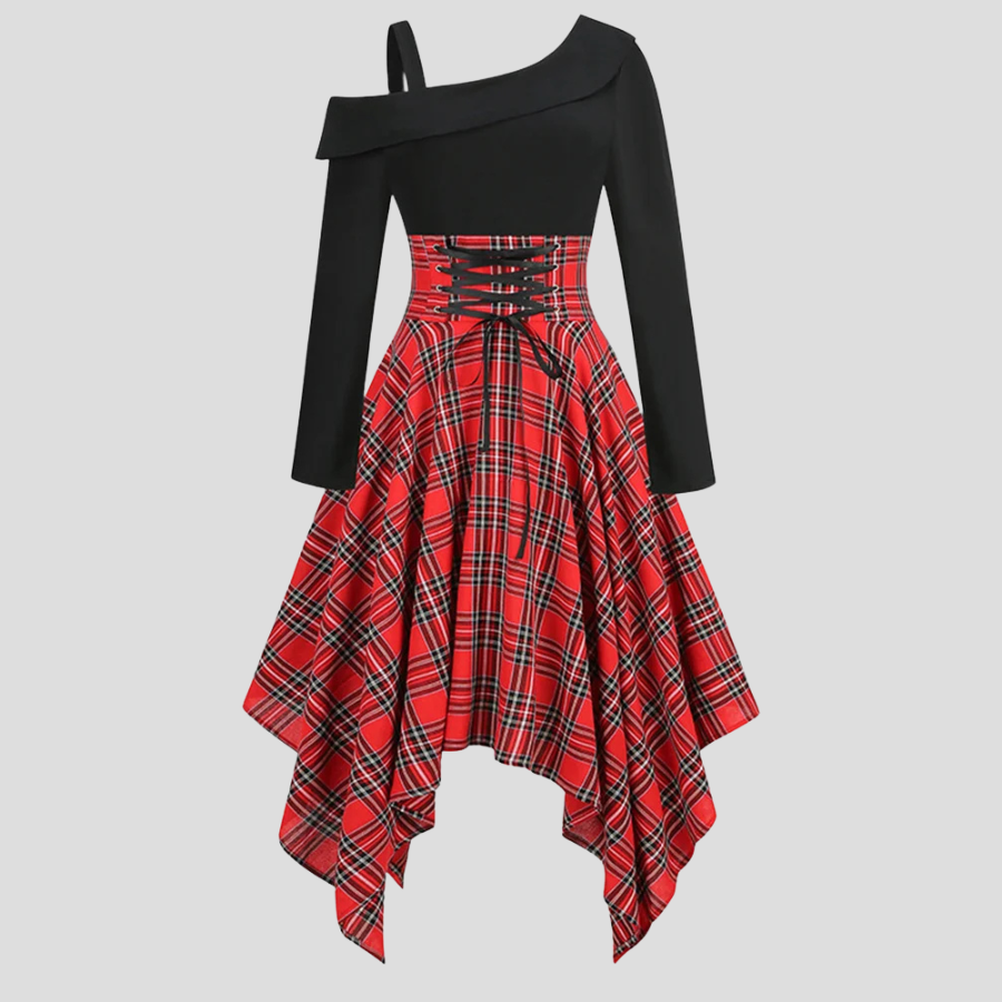 Abito Punk Rock Asimmetrico a Quadri Rossi con Corsetto